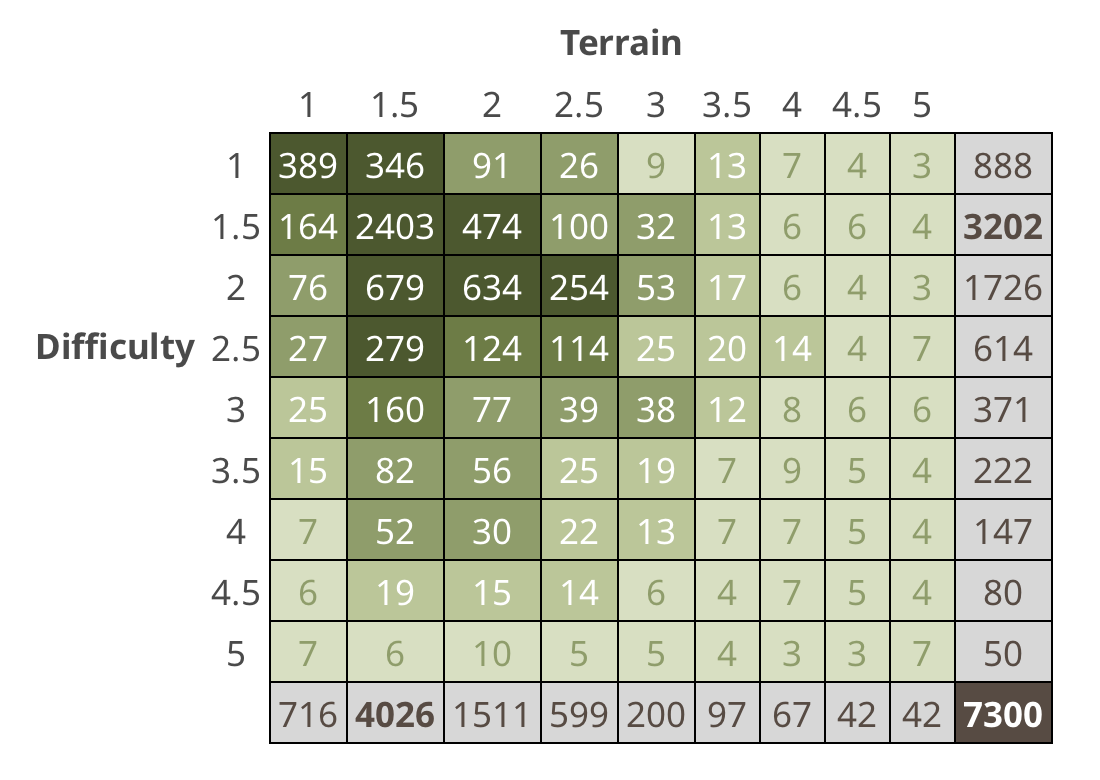 The chart above is a fizzy grid of the difficulty and terrains of caches that are hidden. Difficulty and Terrain 1 is the easiest and Difficulty and Terrain 5 is the most difficult. The ratings are determined by the cache hider. My wife and I cache together, and this is our current fizzy grid. As you can see we have more caches in the upper left and fewer on the right side. The higher terrain ones are a bit more difficult. They require climbing or steep hiking. The hides are dubious, hidden in crevices, or in tree knots, or blend in perfectly with the surroundings. I’m thankful to have some assistance from my teenage children from time to time.