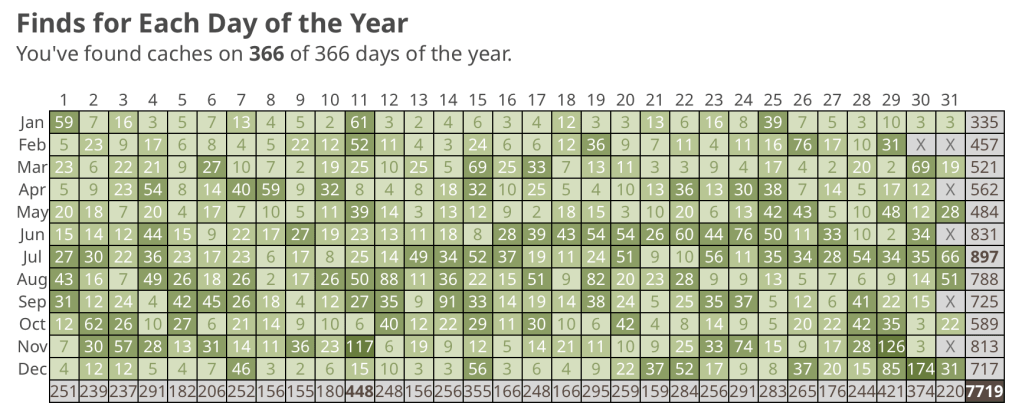 This is our calendar grid. We have found caches on everyday of the year. You may notice the total is different than our fizzy grid. Adventure Labs do not count toward the fizzy grid.