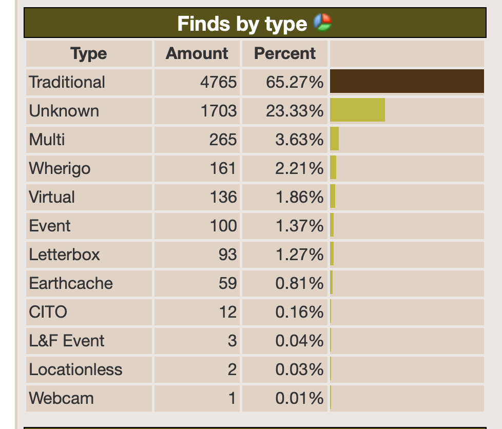 Here are the number of finds by type. Essentially there are hundreds of different stats for one to analyze. Geocaching has been going on since May of 2000. You can fill a jasmer grid with finds that were hidden in every month since May 2000. The oldest surviving geocache is in rural Kansas. It is called Mingo. The cache designation is GC30. The oldest Letterbox is in Illinois. Slices of Quince‘s designation is GC61F. We pay a small fee to operate the geocaching app and the stats are taken care of by some pretty amazing computer techs. All in the name of fun.