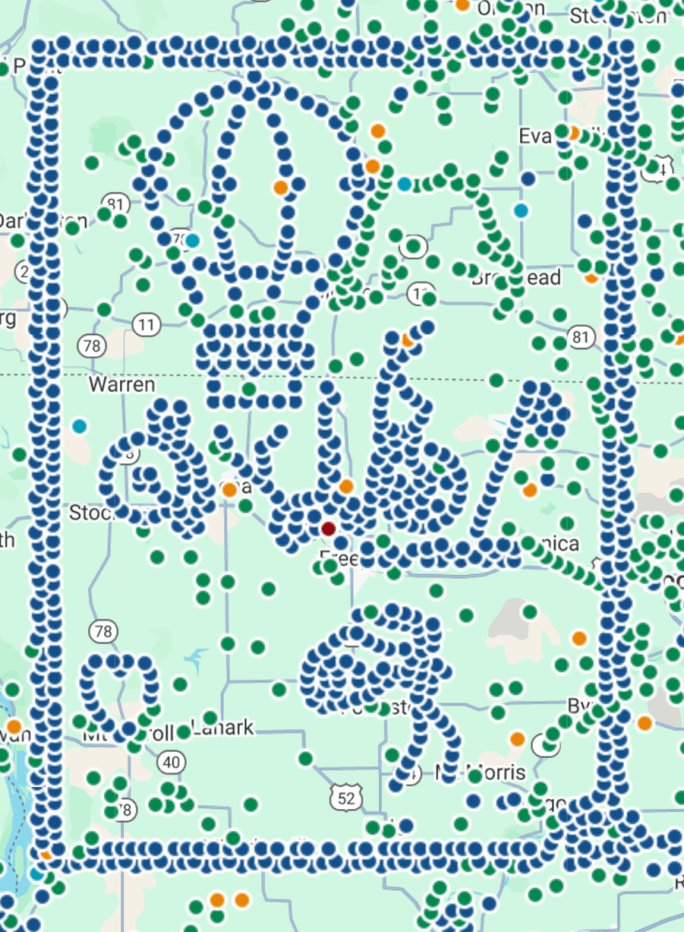 This is an area of eight counties in NW Illinois and SW Wisconsin. Each dot is a cache essentially (Green-traditional, Orange-multicache, Blue-Mystery, Wherigo, Maroon-Event.) There are a dedicated group of geocachers on the far west suburbs of Chicago that wanted to create the Largest Geocaching Art. This is called the Penny Farthing Art. There are well over 1500 hides in this art… and that blank space will be filled… stay tuned… They are hard at work, and they are doing this on their own dime. No one pays us for hiding… We do it for fun!!!