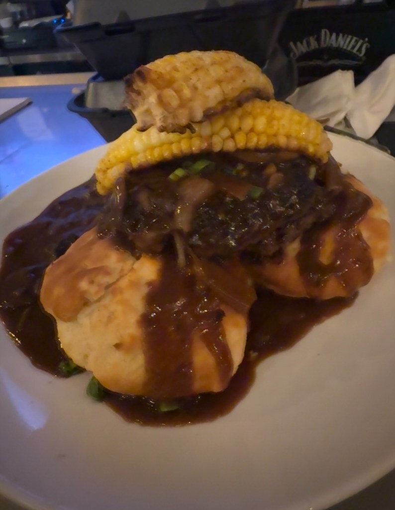 The Salisbury Steak arrived first. The plate appearance is beautiful. The corn ribs in a fold above the meat and demi, with the green onion supplying a contrasting color neatly placed over enormous buttermilk biscuits. This meal is the epitome of comfort food. The meal reminded me of my maternal grandmother’s cooking. She was old school country from a large Catholic family in the heart of Whiteside County Illinois. The biscuits had my heart from the minute I saw them. I stole a few bites of biscuit, and it was decadent. The buttermilk was perfectly balanced with the buttered top. The biscuit had a gentle crispness on the surface and a melt in your mouth center. These biscuits could easily be used for breakfast with a spot of strawberry jam, biscuits and gravy, or just as your side bread with a chicken pot pie. I did not try anything else on my wife’s plate other than the biscuits. My wife assured me that the entire meal was delicious. I can’t wait to have some tomorrow for supper. We usually trade entrees a day later. No other dining experience in the QC offers this service… <sarcastic laugh here>